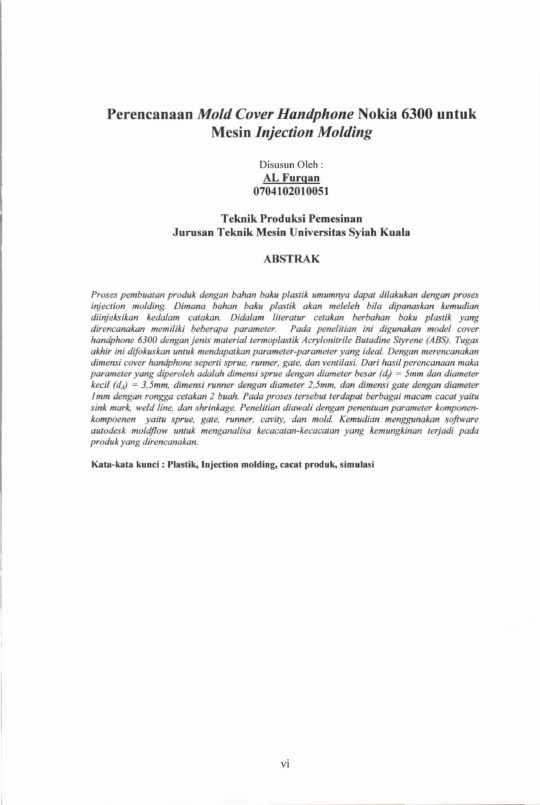 Al Furqan, PERENCANAAN MOLD COVER HANDPHONE NOKIA 6300 UNTUK MESIN INJECTION MOLDING. Banda Aceh Fakultas Teknik,2012