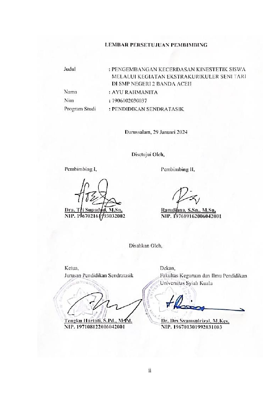 Ayu Rahmanita, PENGEMBANGAN KECERDASAN KINESTETIK SISWA MELALUI KEGIATAN EKSTRAKURIKULER SENI TARI DI SMP NEGERI 2 BANDA ACEH. Banda Aceh Fakultas KIP Pendidikan Sendratasik,2024