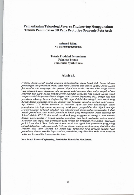 Achmad Rijani, PEMANFAATAN TEKNOLOGI REVERSE ENGINEERING MENGGUNAKANRNTEKNIK PEMINDAIAN 3D PADA PROTOTIPE SOUVENIR PETA ACEH. Banda Aceh Fakultas Teknik,