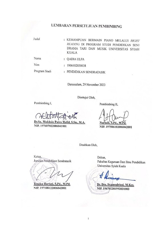Qadia Ulfa, KEMAMPUAN BERMAIN PIANO MELALUI SIGHT READING DI PROGRAM STUDI PENDIDIKAN SENI DRAMA TARI DAN MUSIK UNIVERSITAS SYIAH KUALA. Banda Aceh Fakultas KIP Pendidikan Sendratasik,2024