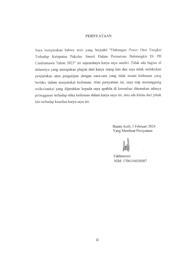 FAKHRURRAZI, HUBUNGAN POWER OTOT TUNGKAI TERHADAP KETEPATAN PUKULAN SMASH DALAM PERMAINAN BULUTANGKIS DI PB CANDRAMAWA TAHUN 2023. Banda Aceh Fakultas KIP Pendidikan Jasmani, Kesehatan dan Rekreasi,2024