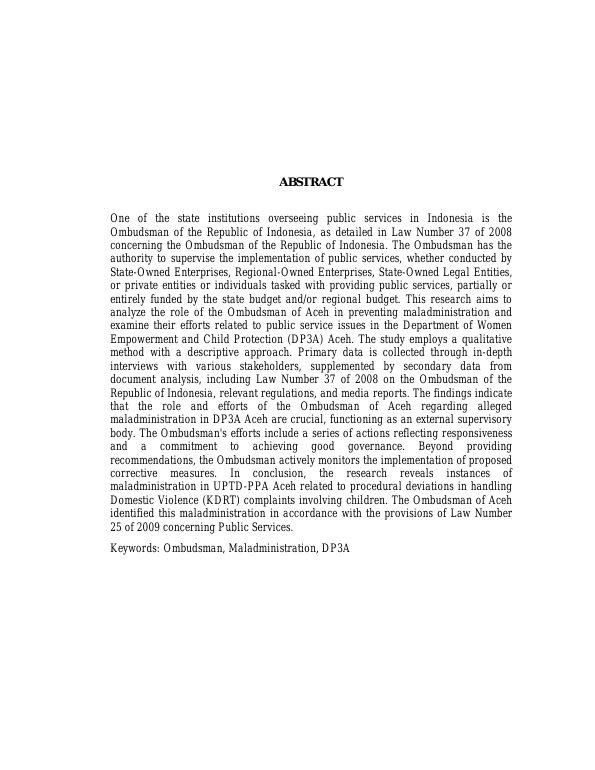 NADIA PRATIWI AYU, ANALISIS PERAN OMBUDSMAN ACEH TERKAIT PENCEGAHAN MALADMINISTRASI BIROKRASI PADA DINAS PEMBERDAYAAN PEREMPUAN DAN PERLINDUNGAN ANAK (DP3A) ACEH. Banda Aceh Fakultas Ilmu Sosial dan Ilmu Politik,2024