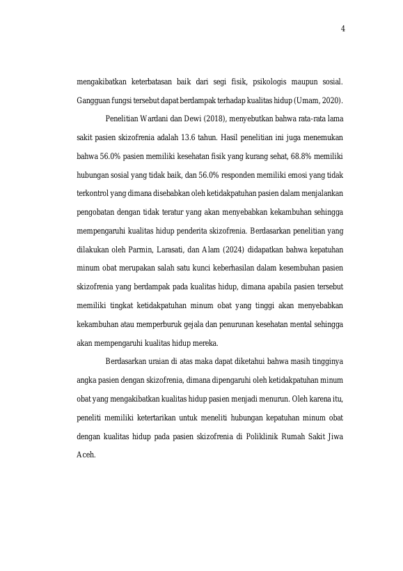ALYA FARISA, HUBUNGAN KEPATUHAN MINUM OBAT DENGAN KUALITAS HIDUP PADA PASIEN SKIZOFRENIA DI POLIKLINIK RUMAH SAKIT JIWA ACEH. Banda Aceh Fakultas Keperawatan,2024