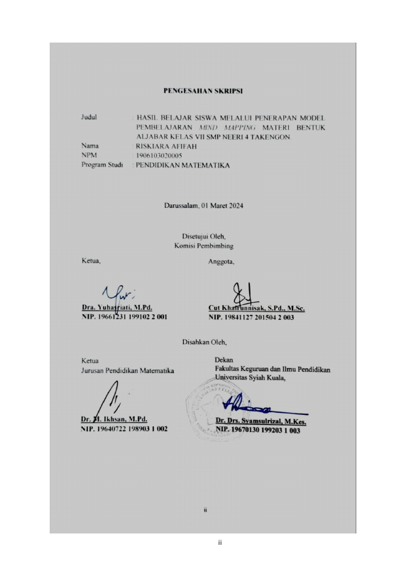 Riskiara Afifah, HASIL BELAJAR SISWA MELALUI PENERAPAN MODEL PEMBELAJARAN MIND MAPPING MATERI BENTUK ALJABAR KELAS VII SMP NEGERI 4 TAKENGON. Banda Aceh Fakultas KIP Pendidikan Matematika,2024
