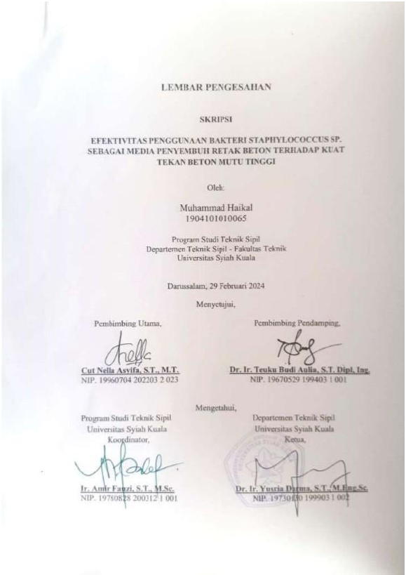 MUHAMMAD HAIKAL, EFEKTIVITAS PENGGUNAAN BAKTERI STAPHYLOCOCCUS SP. SEBAGAI MEDIA PENYEMBUH RETAK BETON TERHADAP KUAT TEKAN BETON MUTU TINGGI. Banda Aceh Fakultas Teknik,2024