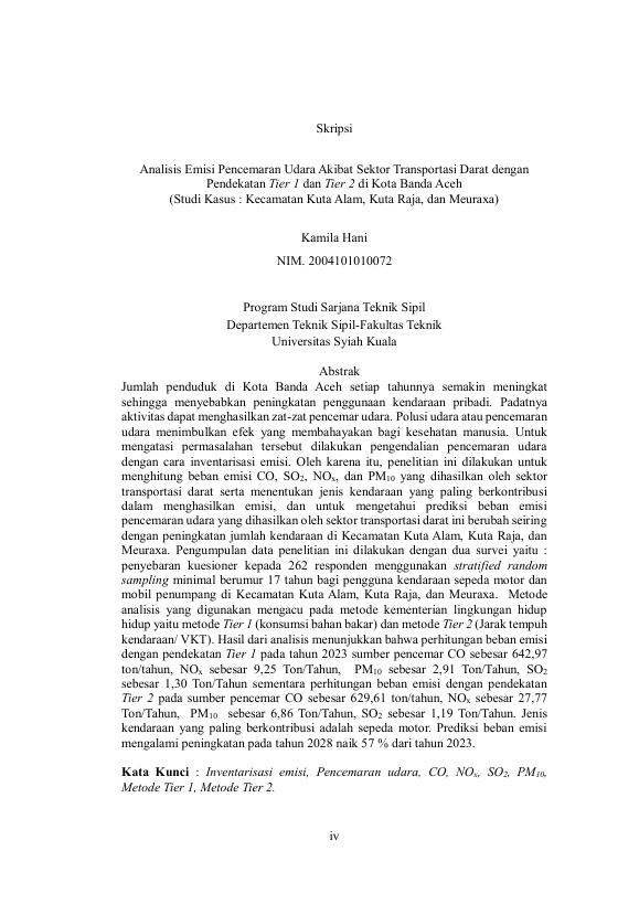 KAMILA HANI, ANALISIS EMISI PENCEMARAN UDARA AKIBATRNSEKTOR TRANSPORTASI DARAT DENGAN PENDEKATANRNTIER 1 DAN TIER 2 DI KOTA BANDA ACEHRN(STUDI KASUS : KECAMATAN KUTA ALAM, KUTA RAJA DAN MEURAXA). Banda Aceh Fakultas Teknik,2024