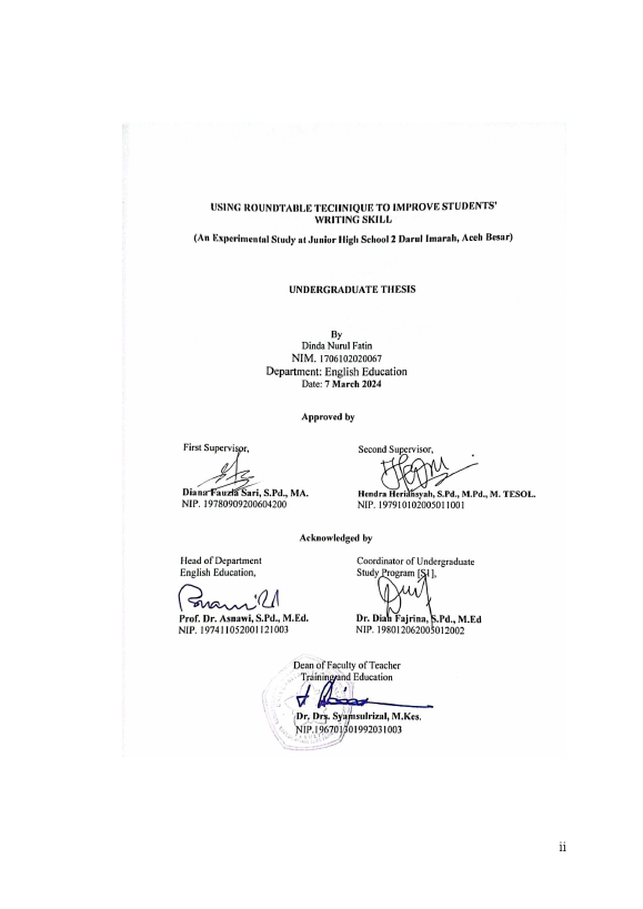 DINDA NURUL FATIN, USING ROUNDTABLE TECHNIQUE TO IMPROVE STUDENTS’ WRITING SKILL (AN EXPERIMENTAL STUDY AT JUNIOR HIGH SCHOOL 2 DARUL IMARAH, ACEH BESAR). Banda Aceh Fakultas KIP Pendidikan Bahasa Inggris,2024