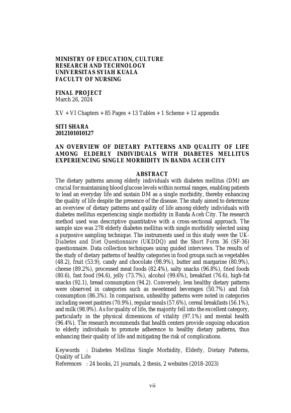 SITI SHARA, GAMBARAN POLA DIET DAN KUALITAS HIDUP PADA LANSIA DIABETES MELITUS DENGAN SINGLE MORBIDITY DI KOTA BANDA ACEH. Banda Aceh Fakultas Keperawatan,2024