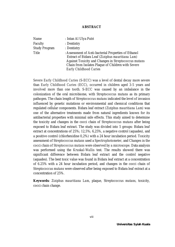 Baca Juga : PENGARUH PEMBERIAN EKSTRAK DAUN BIDARA (ZIZIPHUS MAURITIANA LAM) TERHADAP PERTUMBUHAN DAN PEMBENTUKAN BIOFILM STREPTOCOCCUS MUTANS ISOLAT S-ECC (IN-VITRO) (SAFRIANI AULIA RAHMATILLAH, 2024)