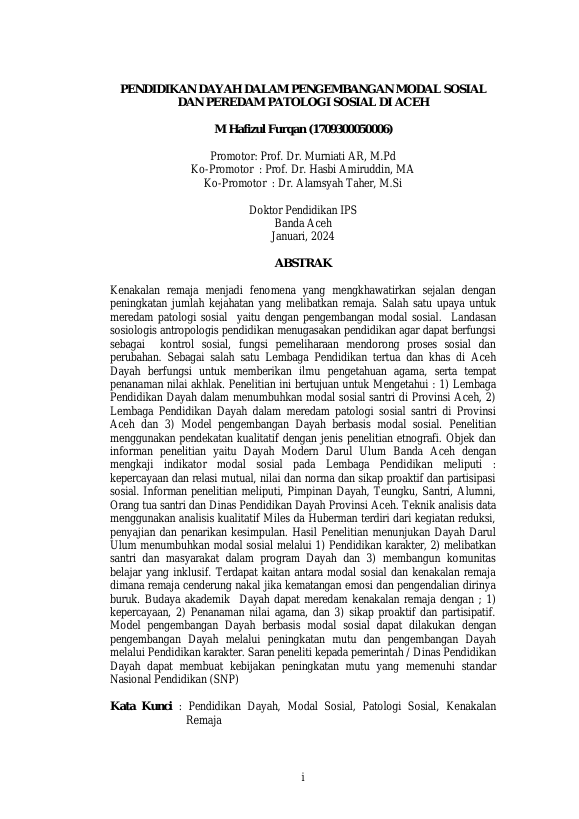 M. Hafizul Furqan, PENDIDIKAN DAYAH DALAM PENGEMBANGAN MODAL SOSIAL DAN PEREDAM PATOLOGI SOSIAL DI ACEH. Banda Aceh Fakultas Pasca Sarjana / Prodi Pendidikan IPS (Fakultas Pasca Sarjana / Prodi Pendidikan IPS (S3)S3),2024