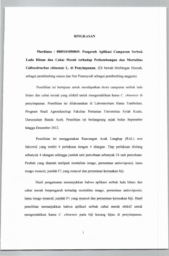Mardiana, PENGARUH APLIKASI CAMPURAN SERBUK LADA HITAM DAN CABAI MERAH TERHADAP PERKEMANGAN DAN MORTALITAS CALLOSOBRUCHUS CHINENSIS L., DI PENYIMPANAN. Banda Aceh Fakultas Pertanian,2013