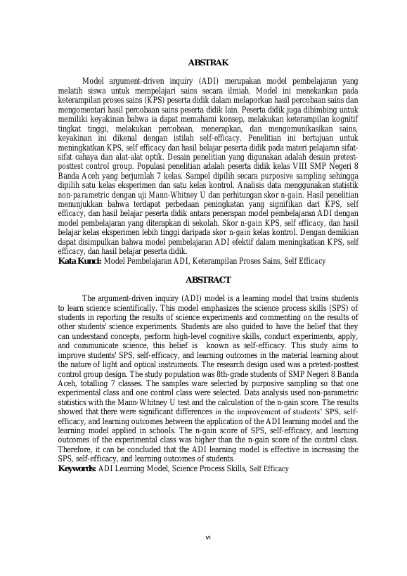 Rizka Nurul Dina, PENERAPAN MODEL PEMBELAJARAN ARGUMENT DRIVEN INQUIRY UNTUK MENINGKATKAN KETERAMPILAN PROSES SAINS DAN SELF EFFICACY PESERTA DIDIK PADA PEMBELAJARAN IPA. Banda Aceh Prog.Studi Magister Pendidikan IPA,2024