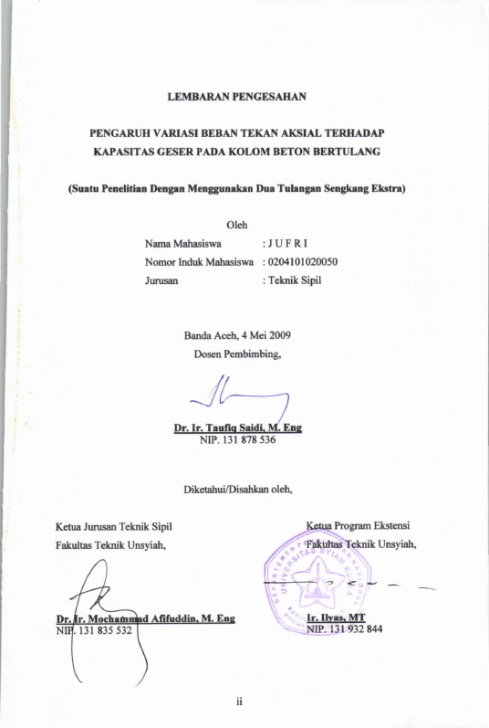 Jufri, PENGARUH VARIASI BEBAN TEKAN AKSIAL TERHADAP KAPASITAS GESER PADA KOLOM BETON BERTULANG (SUATU PENELITIAN DENGAN MENGGUNAKAN DUA TULANGAN SENGKANG EKSTRA). Banda Aceh Fakultas Teknik,2009