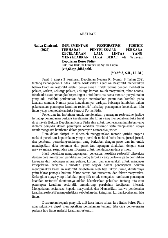 Baca Juga : PENYELESAIAN TINDAK PIDANA PENGANIAYAAN MELALUI RESTORATIVE JUSTICE (SUATU PENELITIAN DI WILAYAH HUKUM POLRESTA BANDA ACEH) (KARTIKA ALYA PUTRI, 2025)