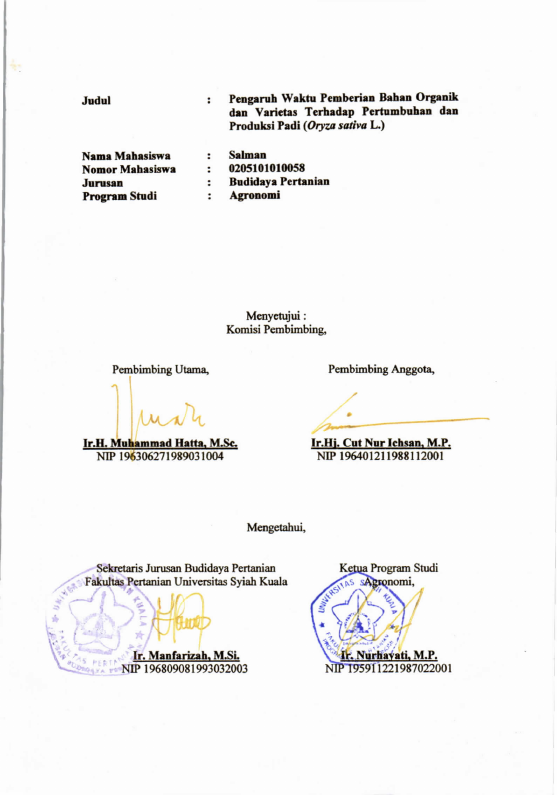 Salman, PENGARUH WAKTU PEMBERIAN BAHAN ORGANIK DAN VARIETAS TERHADAP PERTUMBUHAN DAN PRODUKSI PADI (ORYZA SATIVA L.) DENGAN METODE SRI. Banda Aceh Fakultas Pertanian,2010