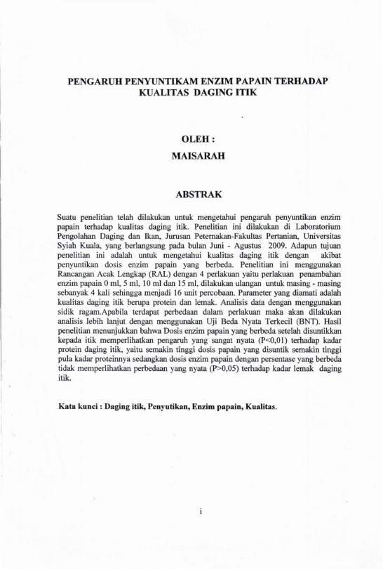 Maisarah, PENGARUH PENYUNTIKAN ENZIM PAPAIN TERHADAP KUALITAS DAGING ITIK. Banda Aceh Fakultas Pertanian,2010