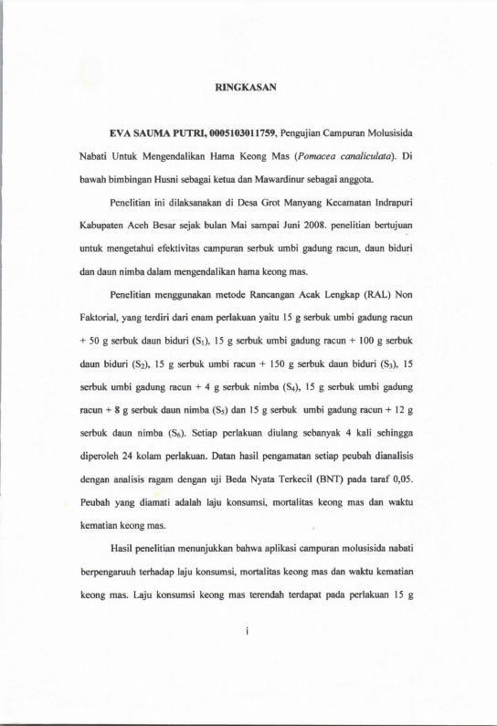 Eva Sauma Putri, PENGUJIAN CAMPURAN MOLUSISIDA NABATI UNTUK MENGENDALIKAN HAMA KEONG MAS (POMACEA CANALICULATA). Banda Aceh Fakultas Pertanian,2008