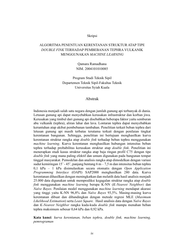 Qamara Ramadhana, ALGORITMA PENENTUAN KERENTANAN STRUKTUR ATAP TIPE DOUBLE FINK TERHADAP PEMBEBANAN TEPHRA VULKANIK MENGGUNAKAN MACHINE LEARNING. Banda Aceh Fakultas Teknik Sipil,2024