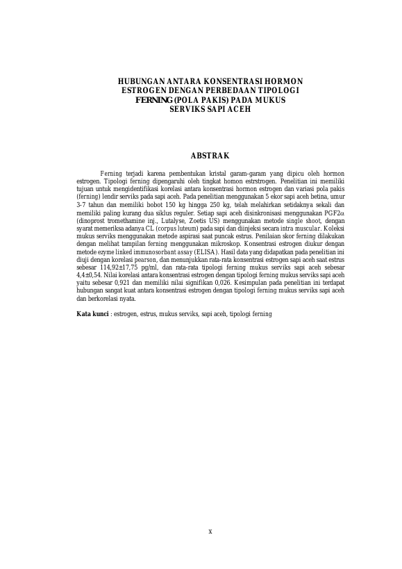Reza Maulana, HUBUNGAN ANTARA KONSENTRASI HORMON ESTROGEN DENGAN PERBEDAAN TIPOLOGI FERNING (POLA PAKIS) PADA MUKUS SERVIKS SAPI ACEH. Banda Aceh Fakultas Kedokteran Hewan,2024