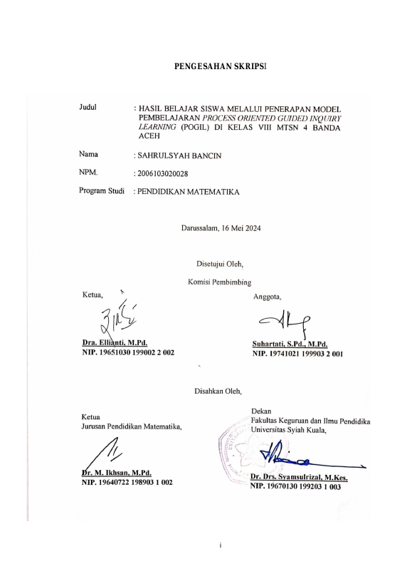 Sahrulsyah Bancin, HASIL BELAJAR SISWA MELALUI PENERAPAN MODEL PEMBELAJARAN PROCESS ORIENTED GUIDED INQUIRY LEARNING (POGIL) DI KELAS VIII MTSN 4 BANDA ACEH. Banda Aceh Fakultas FKIP,