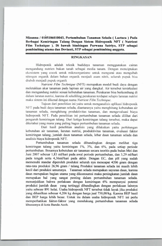 Mizanna, PERTUMBUHAN TANAMAN SELADA ( LACTUCA SATIVA ) PADA BERBAGAI KEMIRINGAN TALANG DENGAN SISTEMRNHIDROPONIK NFT ( NUTRIENT FILM TECHNIQUE ). Banda Aceh Fakultas Pertanian,2008
