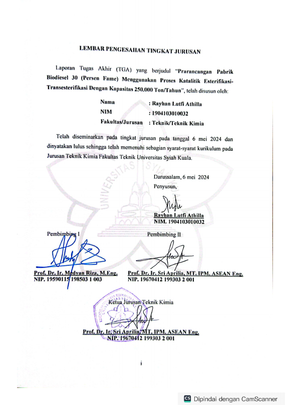 Rayhan Lutfi Athilla, PRARANCANGAN PABRIK BIODIESEL 30 (PERSEN FAME) MENGGUNAKAN PROSES KATALITIK ESTERIFIKASI- TRANESTERIFIKASI DENGAN KAPASITAS 250.000 TON/TAHUN. Banda Aceh Fakultas Teknik Kimia,2024