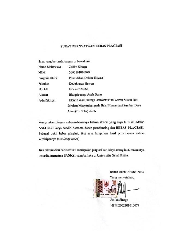 ZELIKA SINAGA, IDENTIFIKASI CACING GASTROINTESTINAL SATWA SITAAN DAN SERAHAN MASYARAKAT PADA BALAI KONSERVASI SUMBER DAYA ALAM (BKSDA) ACEH. Banda Aceh Fakultas Kedokteran Hewan,2024