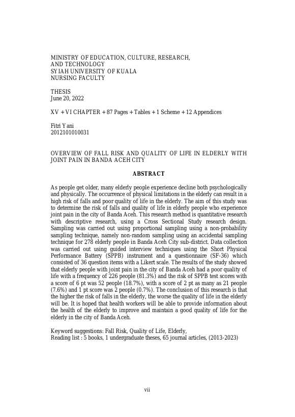 Fitri Yani, GAMBARAN RESIKO JATUH DAN KUALITAS HIDUP PADA LANSIA DENGAN NYERI SENDI DI KOTA BANDA ACEH. Banda Aceh Fakultas Keperawatan (S1),2024