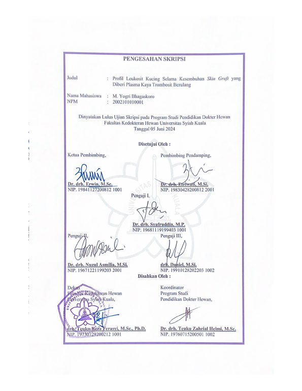 Baca Juga : PROFIL ERITROSIT KUCING LOKAL (FELIS CATUS) SELAMA PROSES KESEMBUHAN SKIN AUTOGRAFT YANG DIBERI PLASMA KAYA TROMBOSIT SECARA BERULANG DAN DIRAWAT DENGAN MOIST DRESSING (Aulia Nurul Kaunain, 2024)