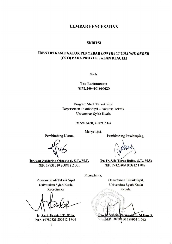 Tita Rachmanieta, IDENTIFIKASI FAKTOR PENYEBAB CONTRACT CHANGE ORDER (CCO) PADA PROYEK JALAN DI ACEH. Banda Aceh Fakultas Teknik Sipil,2024
