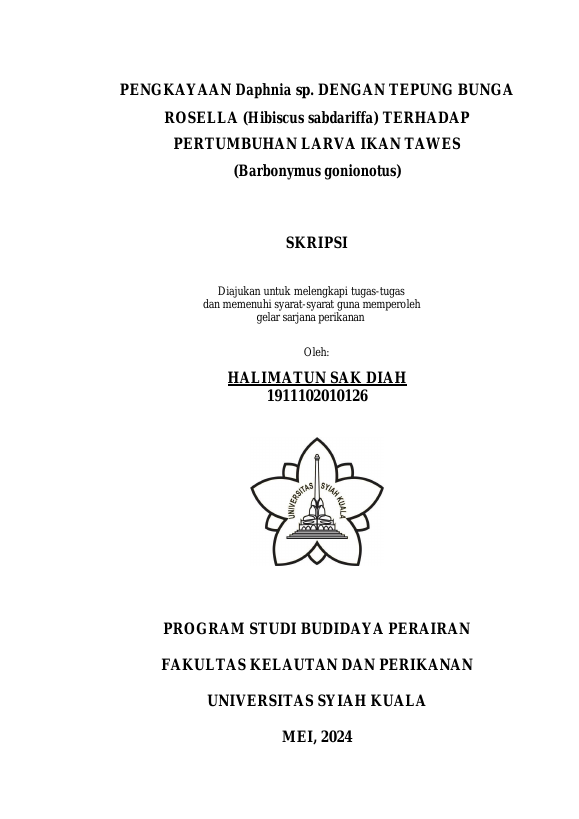 Halimatun Sakdiah, PENGKAYAAN DAPHNIA SP DENGAN TEPUNG BUNGA ROSELLA (HIBISCUS SABDARIFA) TERHADAP PERTUMBUHAN LARVA IKAN TAWES ( BARBONYMUS GONIONOTUS). Banda Aceh Fakultas Kelautan dan perikanan,2024