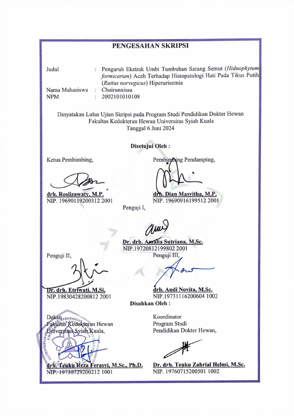 CHAIRUNNISSA, PENGARUH EKSTRAK UMBI TUMBUHAN SARANG SEMUT (HIDNOPHYTUM FORMICARUM) ACEH TERHADAP HISTOPATOLOGI HATI PADA TIKUS PUTIH (RATTUS NORVEGICUS) HIPERURISEMIA.. Banda Aceh Fakultas Kedokteran Hewan,2024