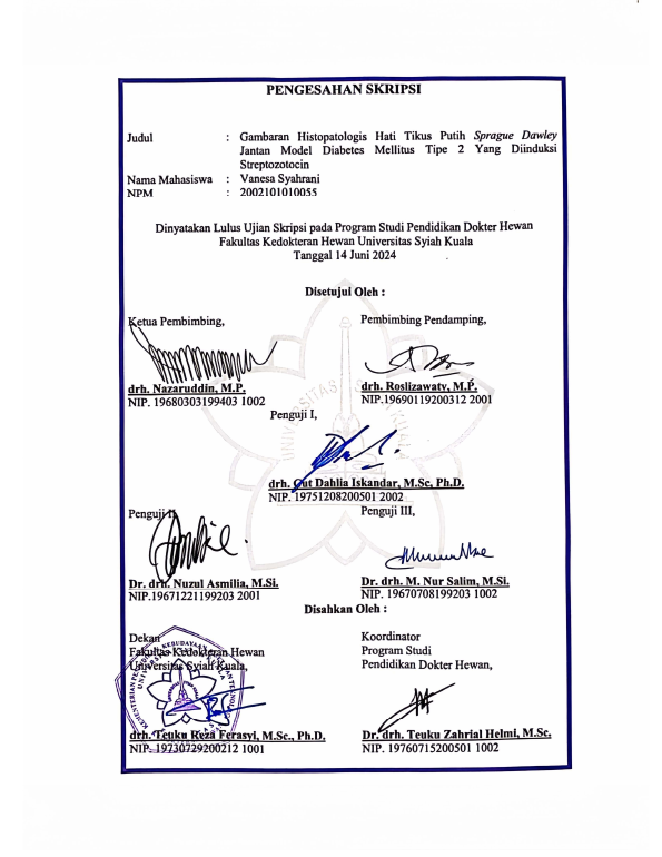 VANESA SYAHRANI, GAMBARAN HISTOPATOLOGIS HATI TIKUS PUTIH SPRAGUE DAWLEY JANTAN MODEL DIABETES MELLITUS TIPE 2 YANG DIINDUKSI STREPTOZOTOCIN (HISTOPATHOLOGICAL OVERVIEW OF THE LIVER IN MALE SPRAGUE DAWLEY RATS AS A TYPE 2 DIABETES MELLITUS MODEL INDUCED BY STREPTOZOTOCIN). Banda Aceh Fakultas Kedokteran Hewan,2024