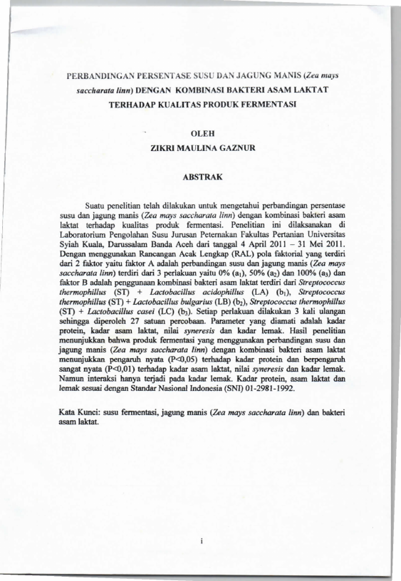 Zikri Maulina Gaznur, PERBANDINGAN PERSENTASE SUSU DAN JAGUNG MANIS (ZEE MAYS SACCHARATA LINN) DENGAN KOMBINASI BAKTERI ASAM LAKTAT TERHADAP KUALITAS PRODUK FERMENTASI. Banda Aceh Fakultas Pertanian,2011