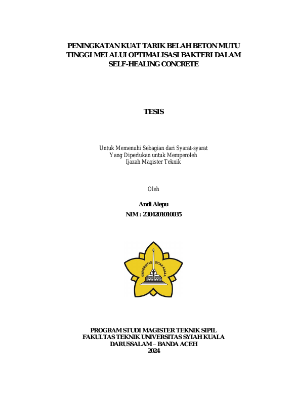 Andi Alepu, PENINGKATAN KUAT TARIK BELAH BETON MUTU TINGGI MELALUI OPTIMALISASI BAKTERI DALAM SELF-HEALING CONCRETE. Banda Aceh Program Studi Magister Teknik Sipil,2024