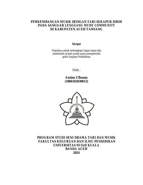 Annisa Ulhusna, PERKEMBANGAN MUSIK IRINGAN TARI SEKAPUR SIRIH PADA SANGGAR LENGGANG MUDE COMMUNITY DI KABUPATEN ACEH TAMIANG. Banda Aceh Fakultas KIP Pendidikan Seni Drama, Tari dan Musik (S1),2024