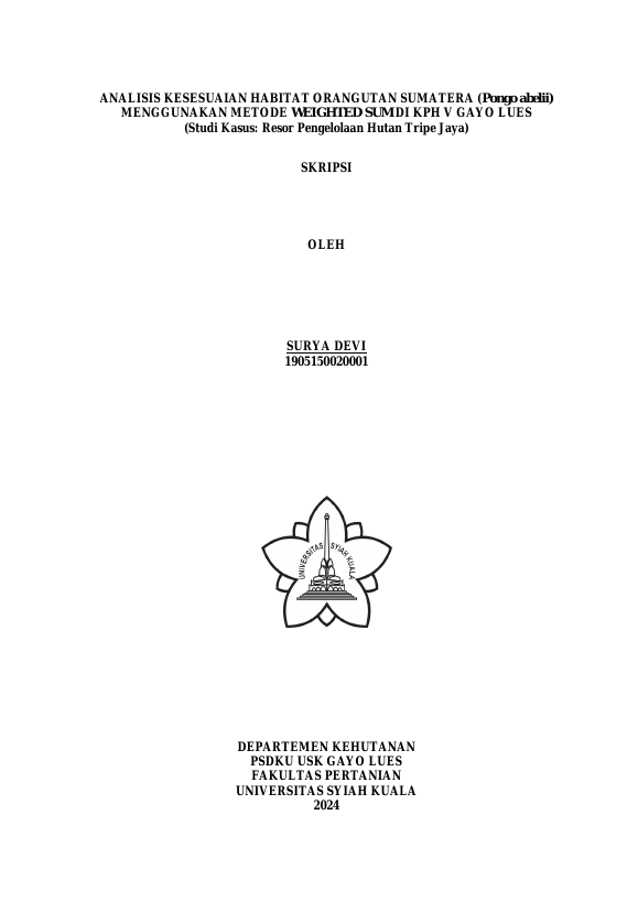 Surya Devi, ANALISIS KESESUAIAN HABITAT ORANGUTAN SUMATERA (PONGO ABELII) MENGGUNAKAN WEIGHTED SUM DI KPH V GAYO LUES (STUDI KASUS: RESOR ENGELOLAAN HUTAN TRIPE JAYA). Banda Aceh Fakultas Pertanian,2024