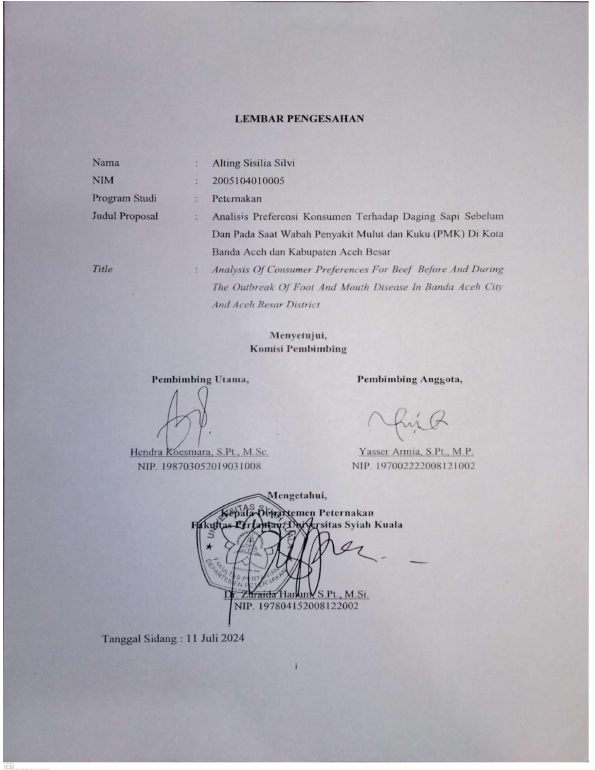 Alting Sisilia Silvi, ANALISIS PREFERENSI KONSUMEN TERHADAP DAGING SAPI SEBELUM DAN PADA SAAT WABAH PENYAKIT MULUT DAN KUKU (PMK) DI KOTA BANDA ACEH DAN KABUPATEN ACEH BESAR. Banda Aceh Fakultas Pertanian Peternakan (S1),2024