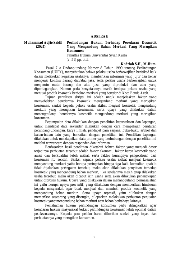 MUHAMMAD ADJIE SAIDIL, PERLINDUNGAN HUKUM TERHADAP PEREDARAN KOSMETIK YANG MENGANDUNG BAHAN MERKURI YANG MERUGIKAN KONSUMEN. Banda Aceh Fakultas Hukum,2024