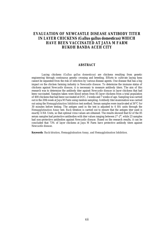 Baca Juga : DETEKSI ANTIBODI SERUM AYAM KAMPUNG (GALLUS DOMESTICUS) TERHADAP VIRUS NEWCASTLE RNDISEASE DI KOTA BANDA ACEH (Wiliana, 2014)