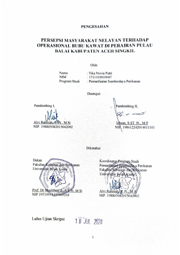 TIKA NOVIA PUTRI, PERSEPSI MASYARAKAT NELAYAN TERHADAP OPERASIONAL BUBU KAWAT DI PERAIRAN PULAU BALAI KABUPATEN ACEH SINGKIL. Banda Aceh Fakultas Kelautan dan Perikanan Pemanfaatan Sumberdaya Perikanan,2024