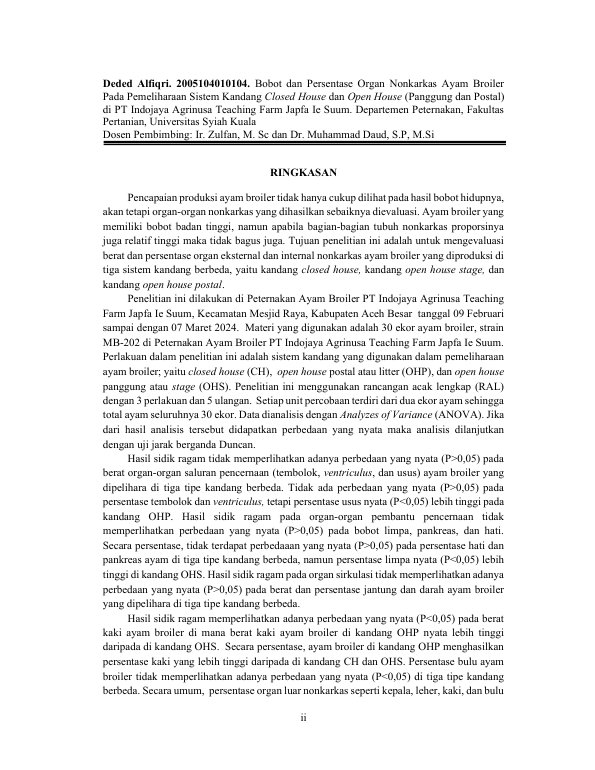 Baca Juga : PERBANDINGAN PERFORMA AYAM BROILER PADA PEMELIHARAAN SISTEM CLOSED HOUSE, OPEN HOUSE POSTAL DAN OPEN HOUSE PANGGUNG DI UNIVERSITY TEACHING FARM UNIVERSITAS SYIAH KUALA IE SUUM, ACEH BESAR (Fuji Anjeli, 2024)