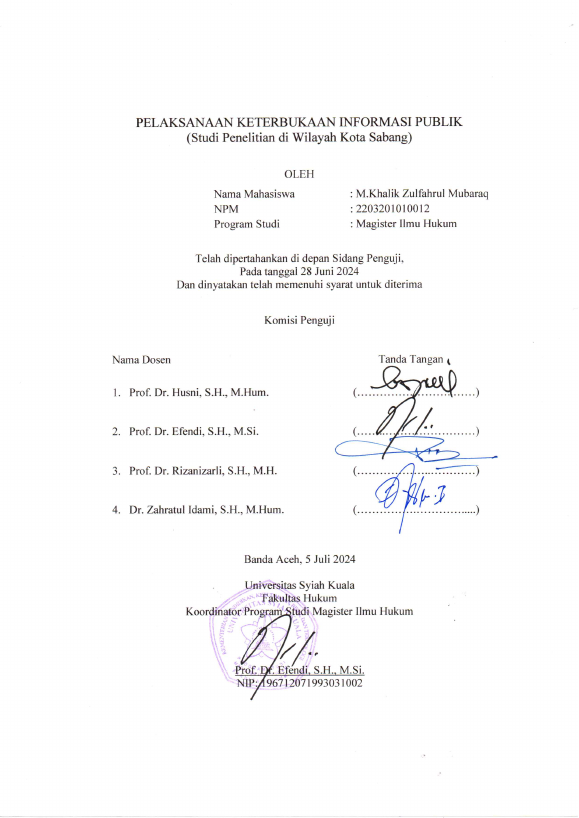 M.Khalik Zulfahrul Mubaraq, PELAKSANAAN KETERBUKAAN INFORMASI PUBLIK (STUDI PENELITIAN DI WILAYAH KOTA SABANG). Banda Aceh Program Studi Magister Ilmu Hukum,2024