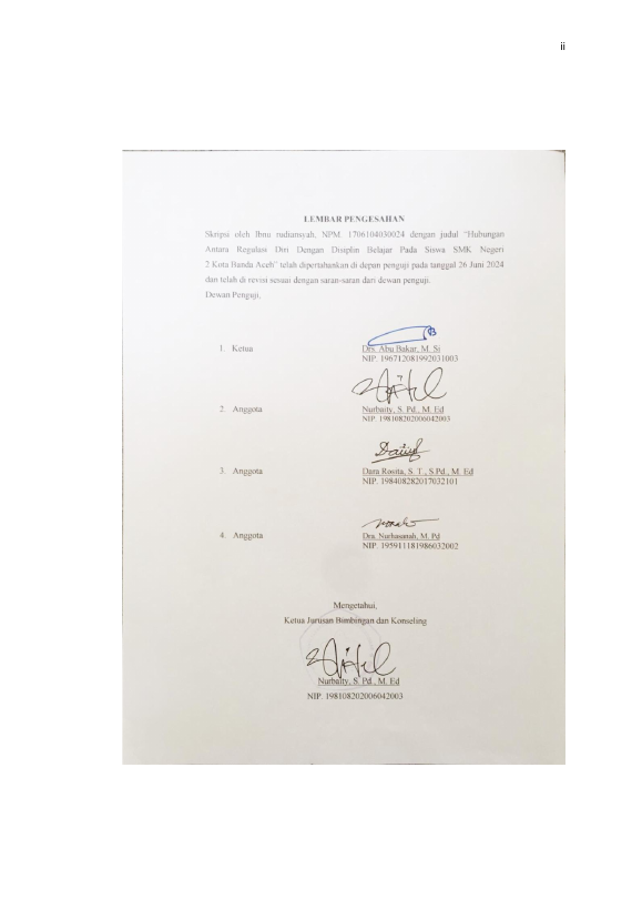 IBNU RUDIANSYAH, HUBUNGAN ANTARA REGULASI DIRI DENGAN DISIPLIN BELAJAR PADA SISWA SMK NEGERI 2 KOTA BANDA ACEH. Banda Aceh Fakultas KIP Pendidikan Bimbingan dan Konseling,2024