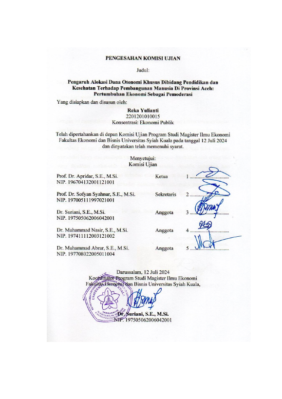 Reka Yulianti, PENGARUH ALOKASI DANA OTONOMI KHUSUS BIDANG PENDIDIKAN DAN KESEHATAN TERHADAP PEMBANGUNAN MANUSIA DI PROVINSI ACEH: PERTUMBUHAN EKONOMI SEBAGAI PEMODERASI. Banda Aceh Program Studi Magister Ilmu Ekonomi,2024