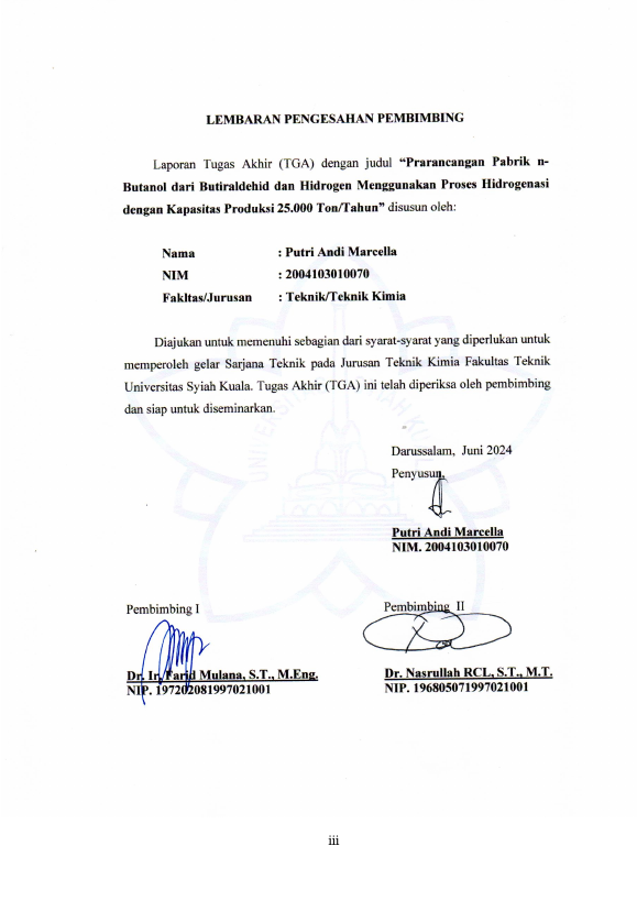 Baca Juga : PRARANCANGAN PABRIK N-BUTANOL DARI BUTIRALDEHIDA DAN HIDROGEN MENGGUNAKAN PROSES HIDROGENASI DENGAN KAPASITAS PRODUKSI 25.000 TON/TAHUN (PUTRI NADYA FAHMY, 2024)
