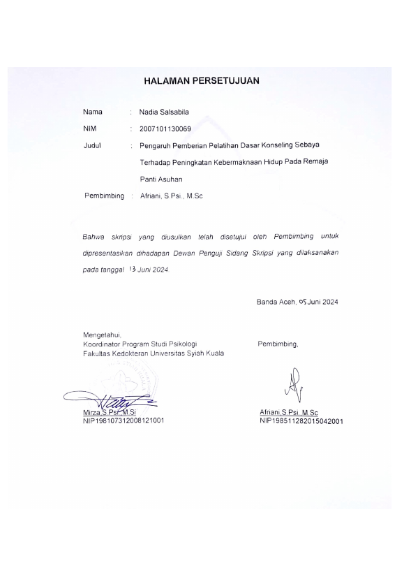 NADIA SALSABILA, PENGARUH PEMBERIAN PELATIHAN DASAR KONSELING SEBAYA TERHADAP PENINGKATAN KEBERMAKNAAN HIDUP PADA REMAJA PANTI ASUHAN. Banda Aceh Fakultas Kedokteran (S1),2024