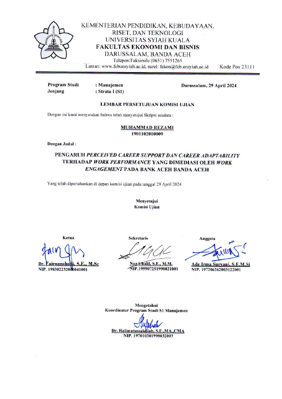 Baca Juga : PENGARUH PERCEIVED CAREER SUPPORT DAN CAREER ADAPTABILITY TERHADAP WORK PERFORMANCE YANG DIMEDIASI OLEH WORK ENGAGEMENT PADA BANK ACEH BANDA ACEH (Muhammad Rezami, 2024)