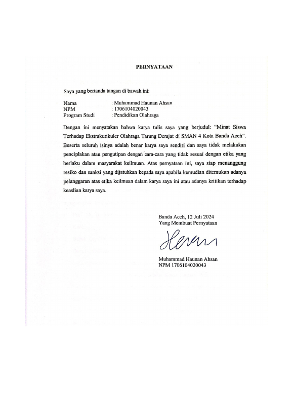 MUHAMMAD HAUNAN AHSAN, MINAT SISWA TERHADAP EKSTRAKURIKULER OLAHRAGA TARUNG DERAJAT DI SMAN 4 KOTA BANDA ACEH. Banda Aceh ,2024