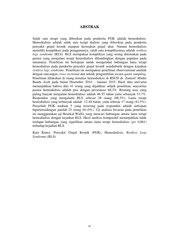 Alfin Radhian, HUBUNGAN LAMA TERAPI HEMODIALISIS PADA PENDERITA PENYAKIT GINJAL KRONIK (PGK) NONDIABETIK DENGAN KEJADIAN RESTLESS LEGS SYNDROME. Banda Aceh Fakultas Kedokteran,2015